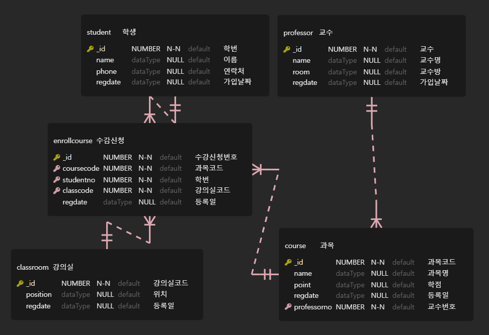 entity 설계 5가지 함. (classroom, student, professor, enrollcouse, course)