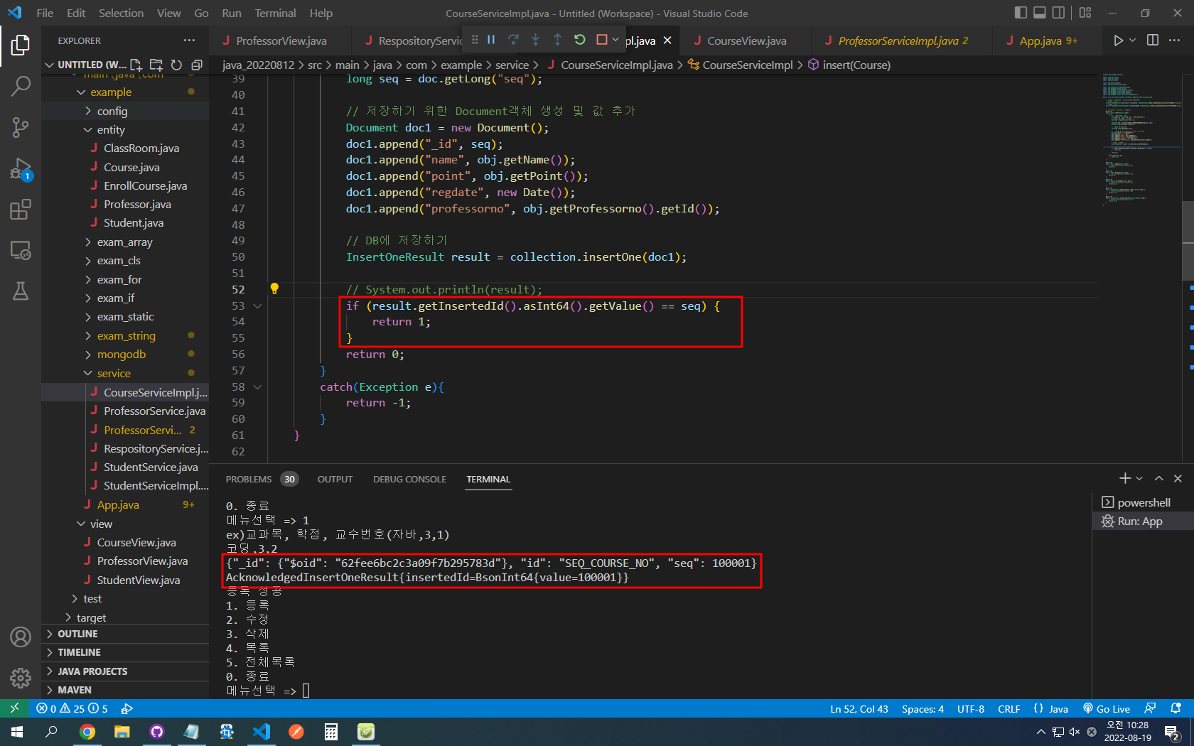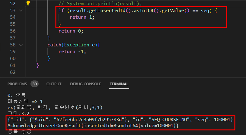 if (result.getInsertedId().asInt64().getValue() == seq) {